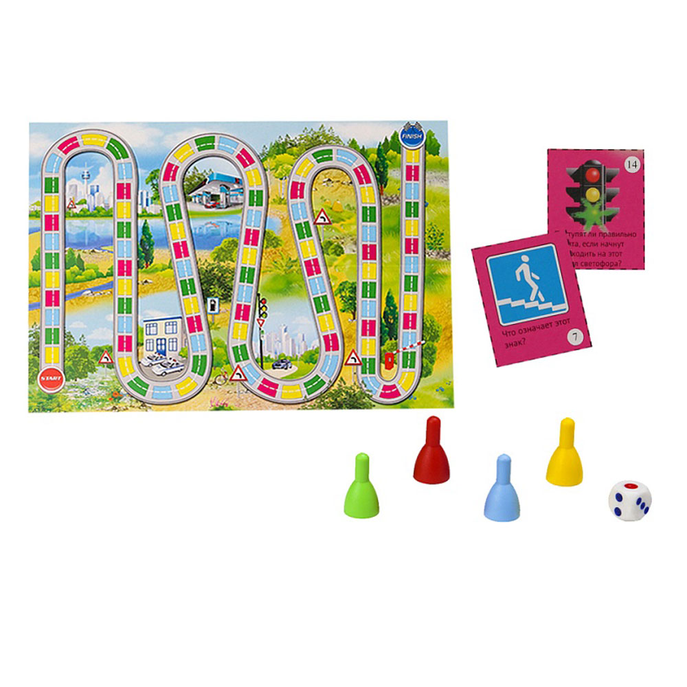 Игра-викторина даёт первичные знания о правилах поведения на дороге. Игровое поле представляет собой игровую дорожку разных цветов. На каждом отрезке игровой дорожки используются соответствующие карточки с вопросами викторины. Победителем в игре становится тот, кто первый доберётся до финиша и правильно ответит на все вопросы. Примеры вопросов из игры: можно ли играть на проезжей части? Сколько всего сигналов у светофора? Перечислите их. Назовите место движения пешеходов. Сколько колес у легкового автомобиля? Назовите места посадки и высадки пассажиров автобуса.