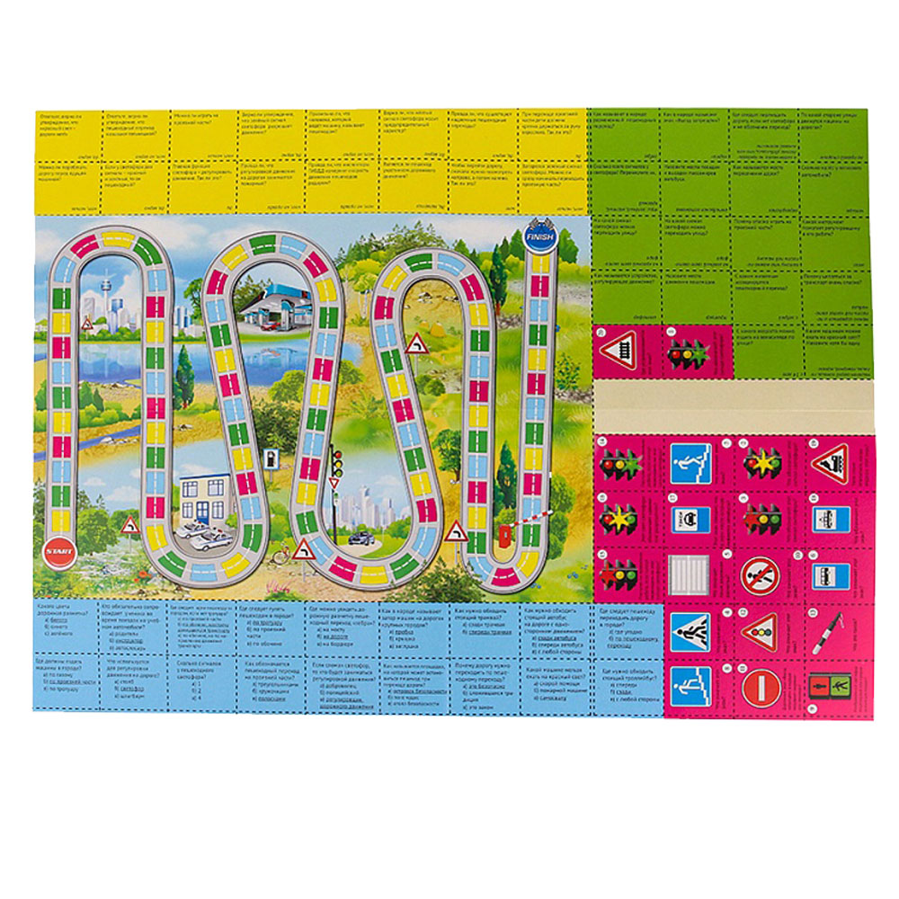 Игровое поле представляет собой игровую дорожку разных цветов. На каждом отрезке игровой дорожки используются соответствующие карточки с вопросами викторины. Победителем в игре становится тот, кто первый доберётся до финиша и правильно ответит на все вопросы.