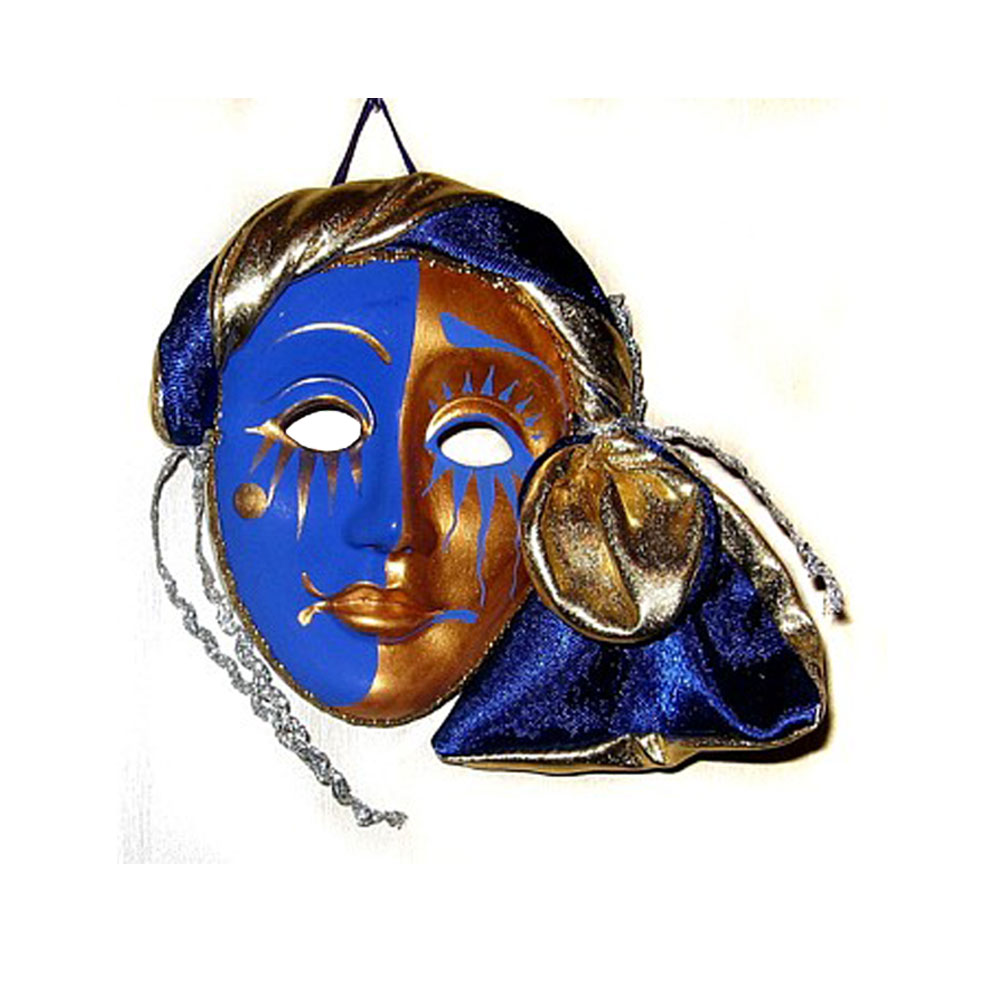 Великолепная карнавальная маска выполнена в ярком сине-золотом цвете. Маска с двумя лицами, изображающими день и ночь станет стильным украшением Вашего интерьера. Размер 13*10 см. |