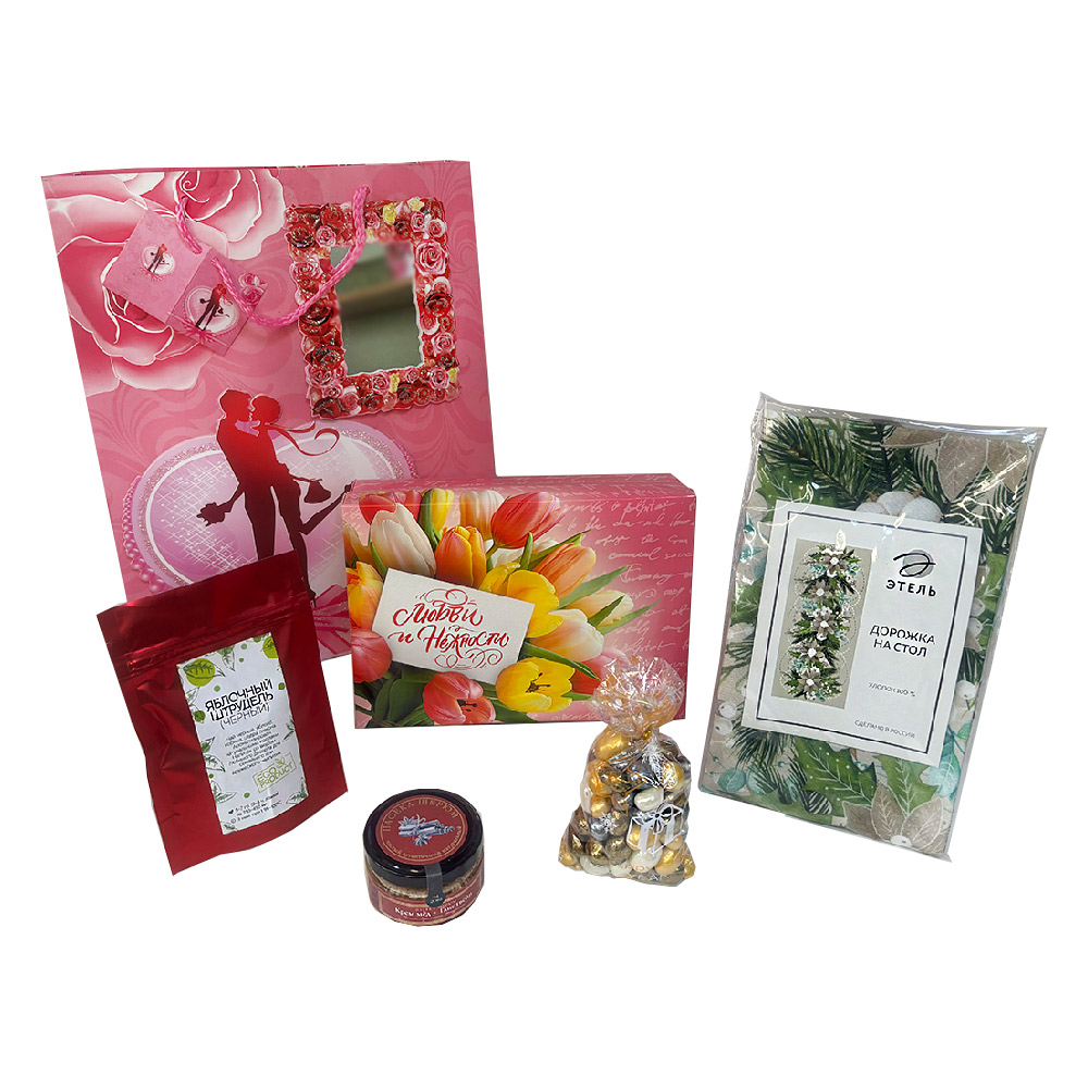 СОСТАВ НАБОРА: 1. ДОРОЖКА НА СТОЛ ЭТЕЛЬ 30Х70, 100% ХЛ, САРЖА 2. КРЕМ МЁД КАКО 65 ГР 3. АРАХИС В ГЛАЗУРИ "ДРАЖЕ ПРАЗДНИЧНОЕ. АССОРТИ", 120 Г 4. ЧАЙ ЧЕРНЫЙ "ЯБЛОЧНЫЙ ШТРУДЕЛЬ", ЯБЛОКО, КОРИЦА, ЦЕДРА ЛИМОНА. АРОМАТИЗИРОВАН НАТУРАЛЬНЫМИ МАСЛАМИ, 25 Г |